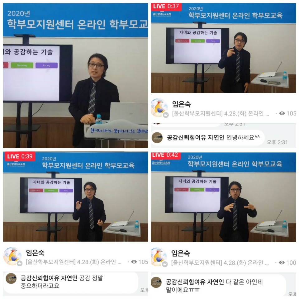 전국 거의 모든 교육지원청을 다녀봤지만, 이번 코로나19 때문에 거의 연기되거나 강의 자체를 시작하지 못하고 있는 이 시점에서 울산교육지원청에서 전국 최초로 온라인으로 학부모교육을 진행하게 되었습니다. 정말... 학부모님들의 반응은 장점에 대해서 많은 이야기를 주셨습니다. 아이들 신경 쓰지 않고 온라인으로 들을 수 있어서 좋고, 교육청 주차장 신경 안 쓰고 집에서 편하게 볼 수 있어서 좋다는 등 많은 장점에 대해서 적어주셨습니다. 이처럼 온라인 강의는 단점보다 찾아보면 장점이 많습니다. 오직 강의를 하는 입장에서는 아무래도 학부모님들과 현장에서 눈을 보고 이야기를 나눌 수 있는 가장 좋은 사람과 사람으로서의 만남이 아쉽습니다. 또 현장의 느낌이 아니라 카메라나 스마트폰을 보면서 강의를 해야 하다 보니 강의력에서 떨어지는 느낌을 받을 수밖에 없는 것은 사실입니다. 하지만 어제 강의에서 현실감이 떨어지지 않도록 최선을 다했습니다.^^