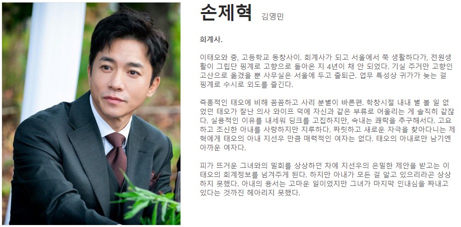 부부의 세계에서 김희애와 박해준 부부관계뿐만 아니라 박선영과 김영민 부부관계에 대한 장면들이 많이 나옵니다. 김영민이 연기하는 손제혁이라는 인물은 이태오와 중고등학교 동창 사이이고 회계사가 되어서 고향에 돌아온 인물입니다. 드라마 중반까지 김영민은 업무 특성상 귀가가 늦는 걸 핑계로 수시로 외도를 즐기는 인물로 나옵니다. 고요하고 조신한 아내를 사랑하지만 짜릿하고 새로운 자극을 찾아다니면서 외도를 즐기는 인물로 그려집니다. 그러다 14회에서는 김영민이 자신의 잘못을 깨닫고 박선영에게 끊임없이 용서를 구하는 모습을 보이면서 박선영의 마음이 드디어 열리는 모습을 보였습니다.
