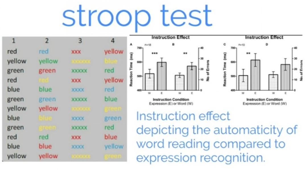 원래 노란색(yellow)은 노란색이어야 합니다. 그런데 글자 의미는 노란색인데 색깔이 빨간색 yellow면, 엇박자가 납니다. 이처럼 의미와 색깔이 다르면, 즉각적으로 찾아내거나 반응하기가 어렵습니다. 이런 현상을 심리학에서 '스트룹 효과'라고 합니다.