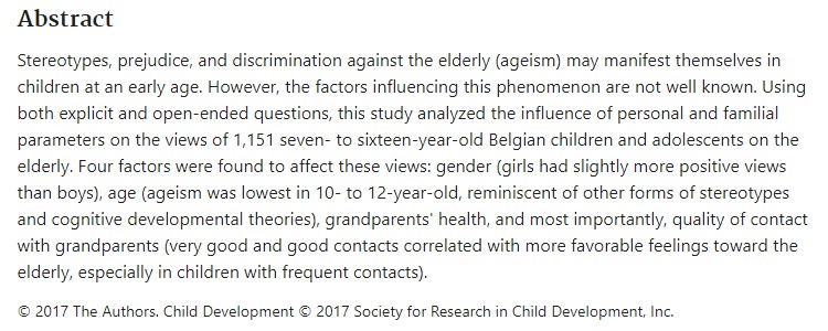 2017년 벨기에 리에 대학교 알리손 플라미온(Allison Flamion) 교수팀에서 '조부모와의 접촉이 어르신들에 대한 아동과 청소년의 관점에 미치는 영향(Impact of contact with gramparents on children's and adolescents' views on the ederly'라는 논문을 아동발달학회지에 발표했습니다.