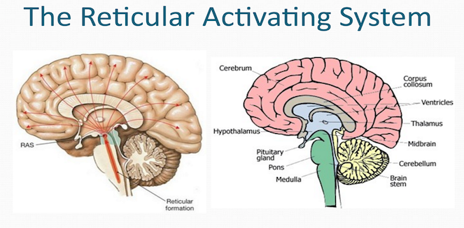 뇌에는 '망양체'라는 것이 있습니다. 망은 그물을 뜻합니다. 양은 모양을 뜻합니다. 즉 그물 모양 부분을 말합니다. 이 부분은 뇌의 중뇌에서 연수(=숨뇌)에 걸친 부분을 말합니다. 특수한 구조를 한 신경세포와 신경 섬유의 집단입니다. 영어로는 'reticular formation'이라고 합니다. reticular는 '그물 모양의', '뒤얽힌'이라는 뜻입니다. 영어로 그물조직을 reticular tissue라고 합니다. 발음을 할 때는 '리티큘럴'라고 말합니다. 우선 그림으로 확인을 하겠습니다.