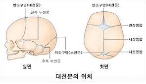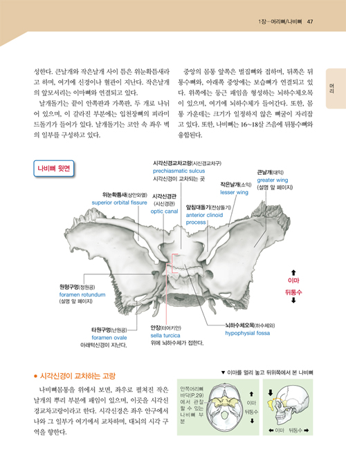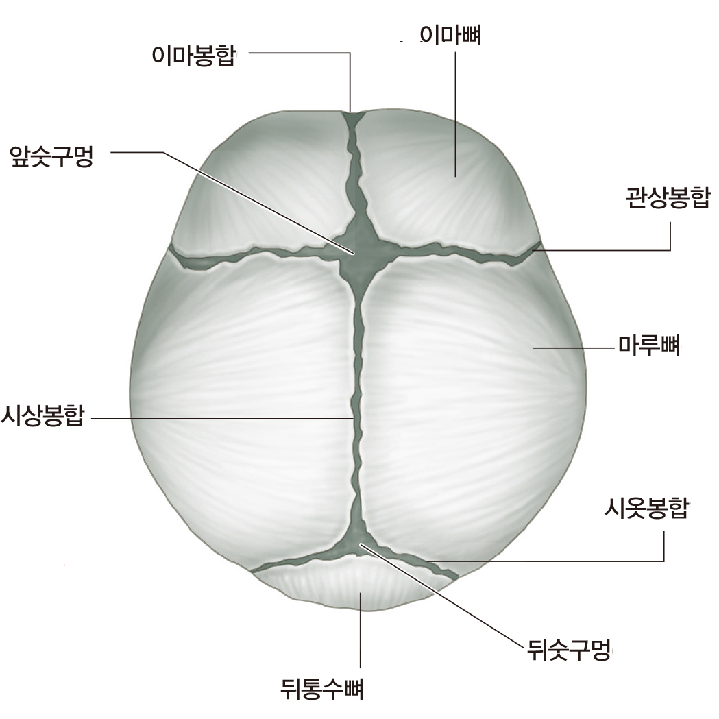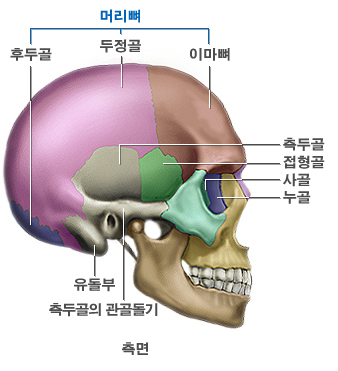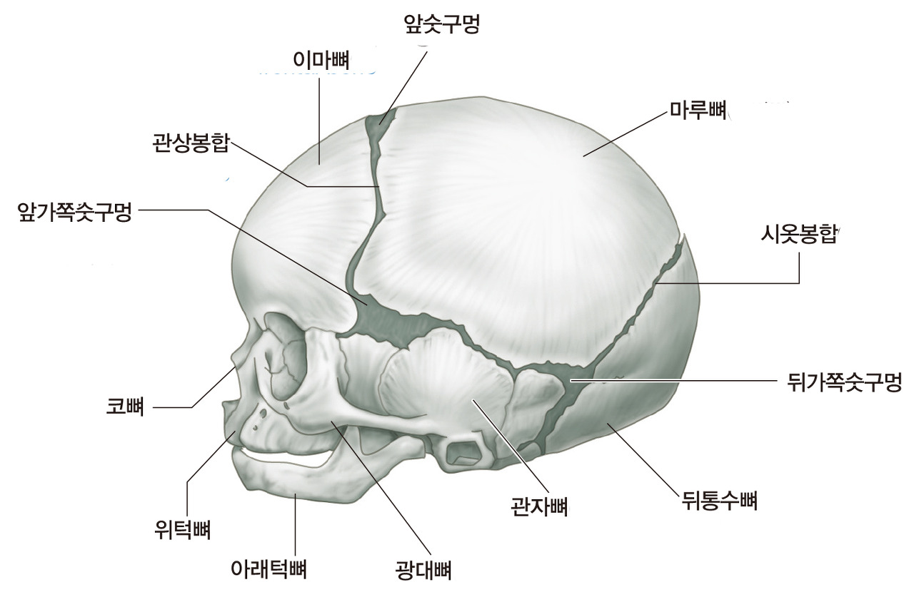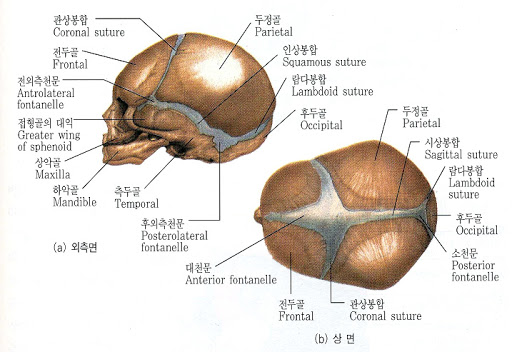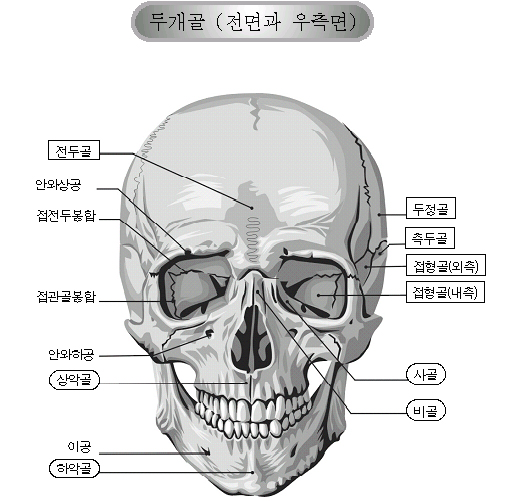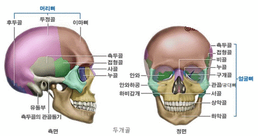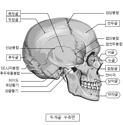 1. 두개골: 22개의 뼈로 구성, 봉합 형태