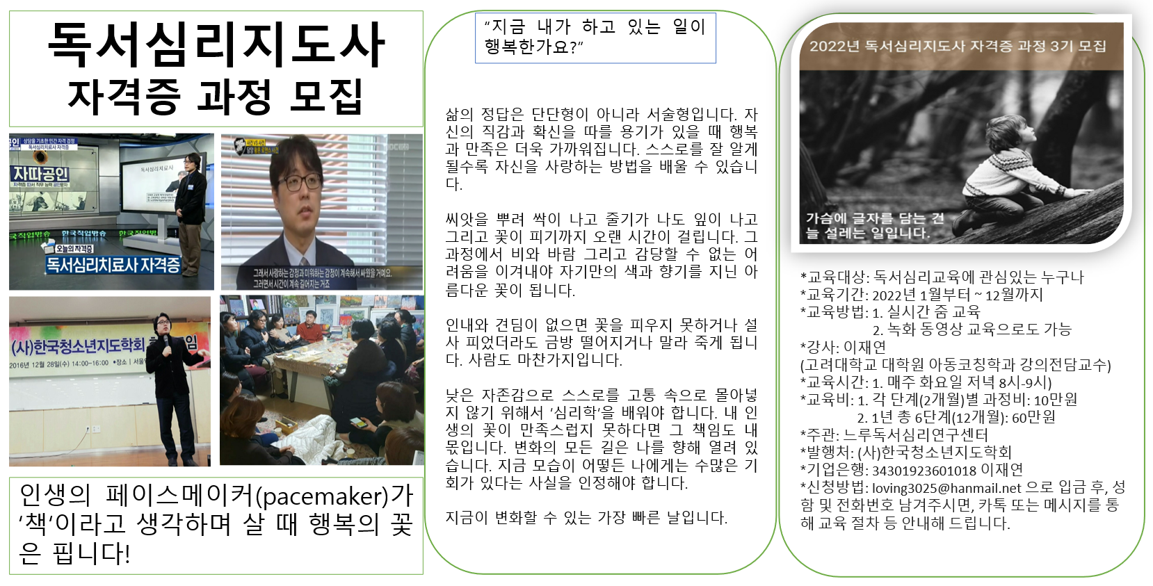 | 독서심리치료를 공부하면 시각이 달라집니다 (0) | 2022.02.10 |