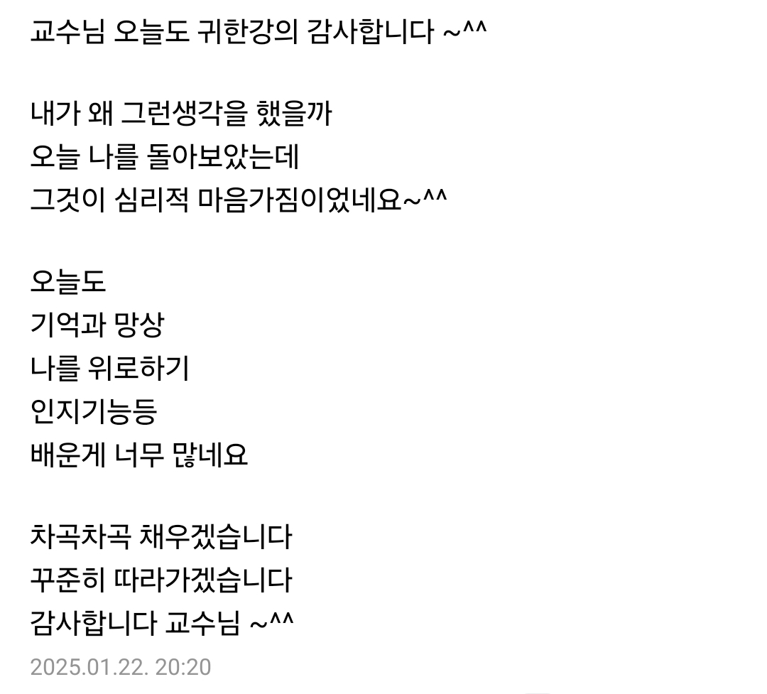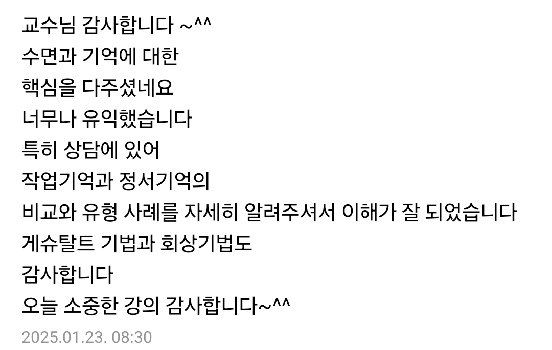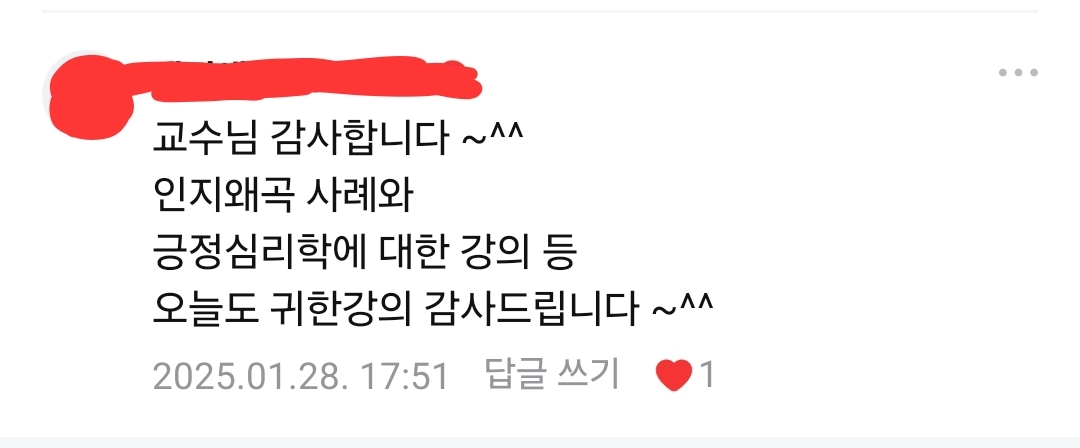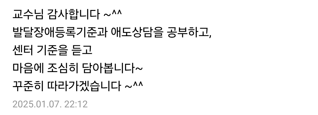 정말... 마지막으로 이야기드리고 싶습니다. 절대로 후회하지 않으실 겁니다. 책을 좋아하지만 '심리학'이론을 배우기 두려워서 주저하시는 분들이라면 단 1단계라도 들어보시고 판단하시길 바랍니다. 그리고 시작하려고 할 때 절대로 늦은 시기는 없습니다. 언제든 도전하시면 됩니다. 그 이유는 6년이 넘는 동안 모든 강의를 녹화해서 제공하고 있기 때문에 언제 시작하시든 모든 강의를 다 들으면서 따라오실 수 있습니다. 또한 중간에 들어오셔도 어떤 강의를 먼저 들어야 하는지 어찌 공부를 해야 좋은지에 대해 자세히 이야기드릴 것입니다. 그러니 주저하지 마시고 도전하시길 바랍니다.
